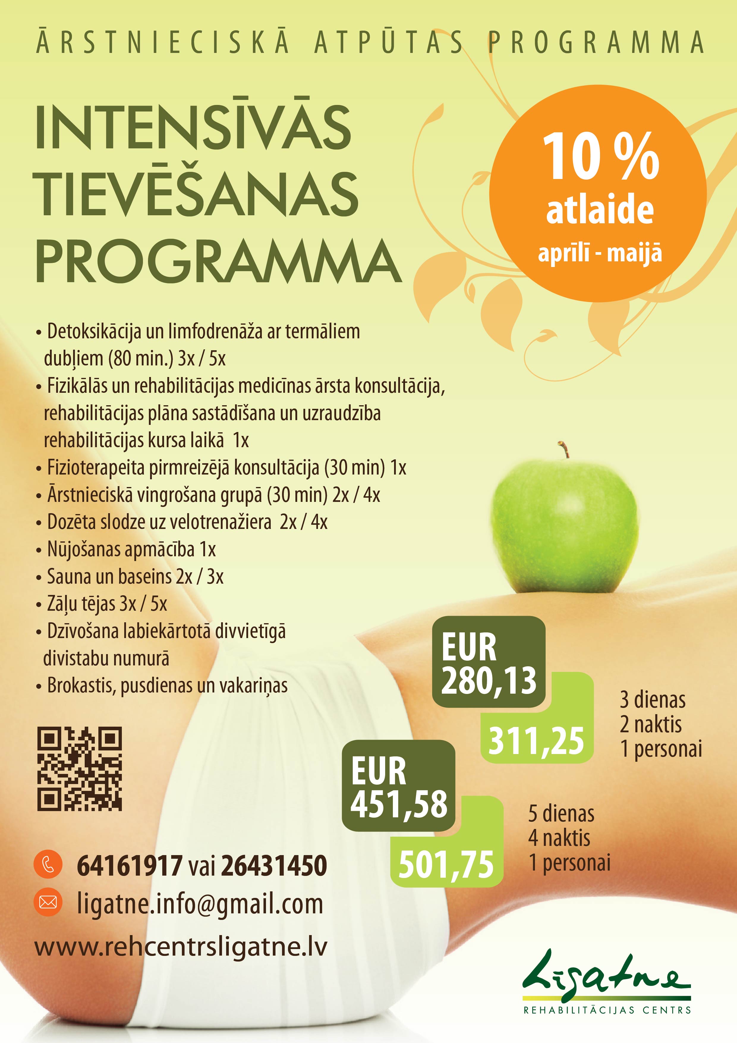 Ir pavasaris, kad mēs visi gribam izskatīties skaisti! Nāc uz rehabilitācijas centru “līgatne” un sper pirmo soli pretī skaistam augumam! "Intensīvās tievēšanas programma" ir orientēta uz tūsku mazināšanu un dziļu attīrīšanu. Programmā ietvertā detoksikācija un limfodrenāža ar termāliem dubļiem aktivizē limfātiskās sistēmas darbību. Aktīvās detoksikācijas un audu nostiprinošais efekts mazina apjomu un izlīdzina ādas reljefu. Aprīlī un martā piedāvājam 10 % atlaidi!