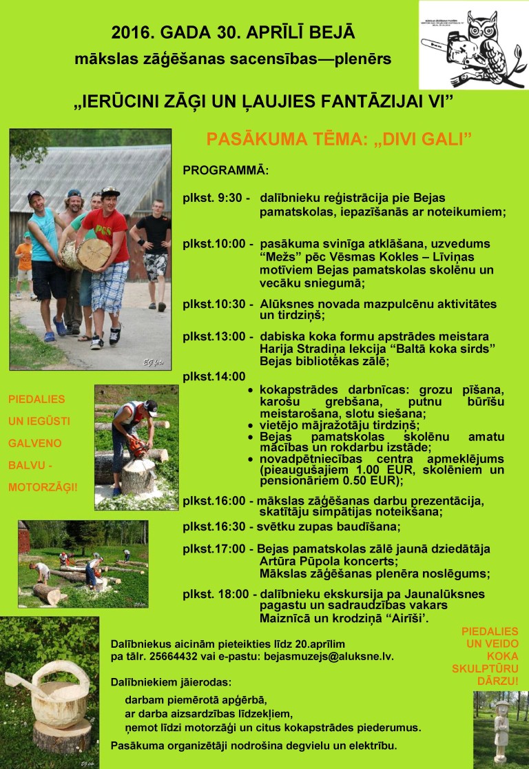 Plenēra dalībniekiem šogad no koka būs jāveido skulptūras, ņemot vērā pasākuma tēmu – “Divi gali”. Ikviens, kas vēlas piedalīties plenērā un ir gatavs pārbaudīt savas spējas un prasmes ar motorzāģi no bluķa izgatavot koka skulptūru, aicināts pieteikties plenēram līdz 20. aprīlim pa tālruni 25664432 vai e-pastu [email protected].