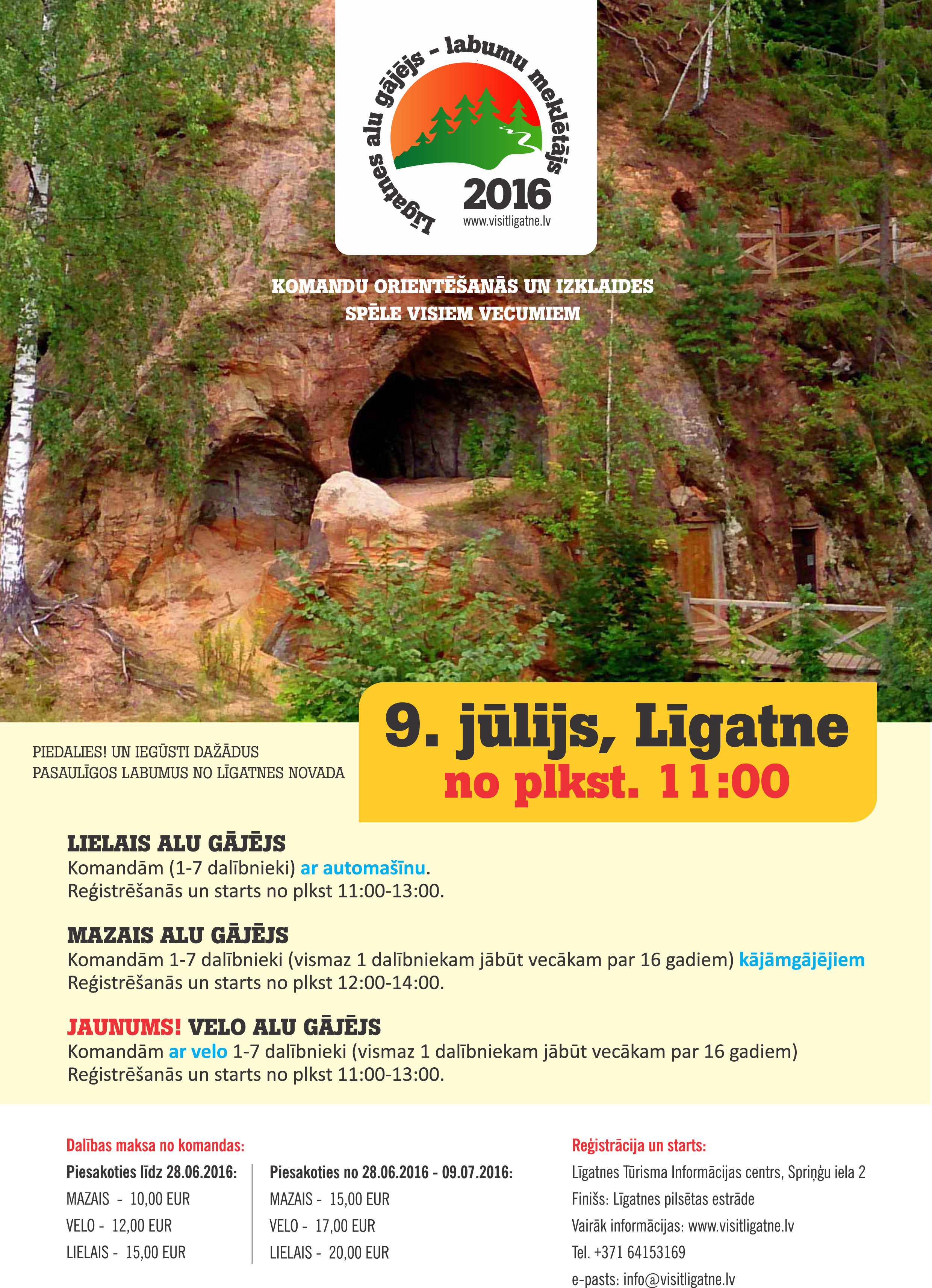 9. jūlijā jau piekto gadu pēc kārtas Līgatnes takās notiks komandu orientēšanās un izklaides spēle ALU GĀJĒJS 2016. Līgatne ir unikāla vieta Latvijā, jo tieši šeit pilsētas centrā slejas klintis un tikai 7.4km2 lielā pilsētas teritorijā atrodas vairāki simti alu pagrabi, katrs ar savu stāstu.