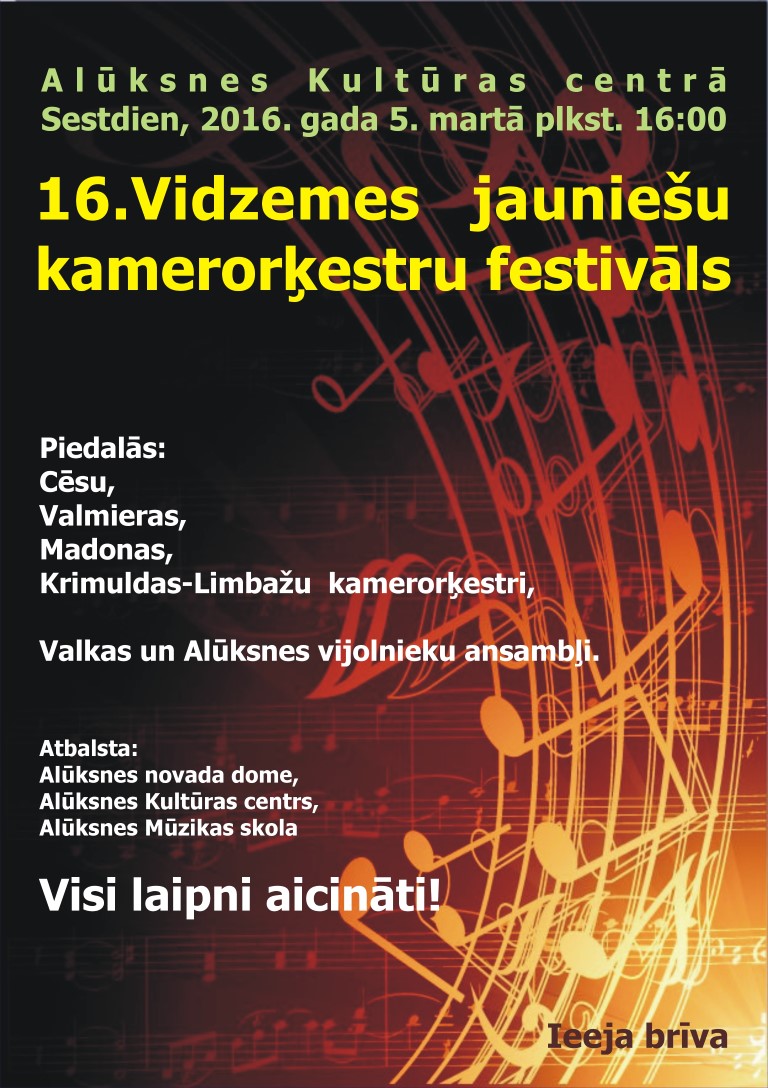 Sestdien, 5. martā Alūksnes Kultūras centrā notiks jau 16. Vidzemes jauniešu kamerorķestru festivāls, kurā dažādus klasiskās mūzikas skaņdarbus, sākot no baroka līdz mūsdienu mūzikai, atskaņos ap pusotra simta jauno mūziķu.