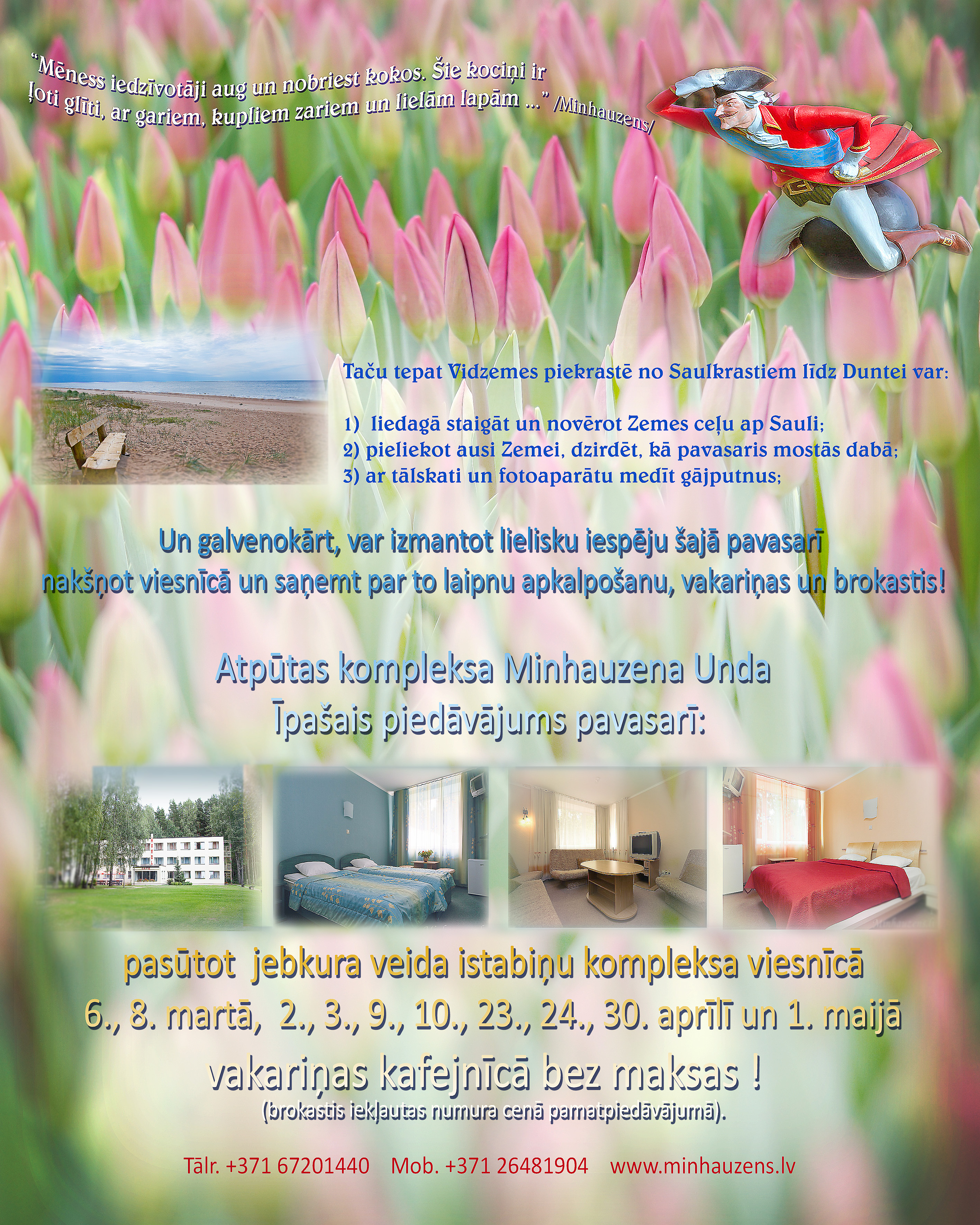 Atpūtas kompleksa Minhauzena Unda īpašais piedāvājums pavasarī: pasūtot jebkura veida istabiņu kompleksa viesnīcā 6., 8. martā, 2., 3., 9., 10., 23., 24., 30. aprīlī un 1. maijā - vakariņas kafejnīcā bez maksas! (brokastis iekļautas istabiņas cenā pamatpiedāvājumā).