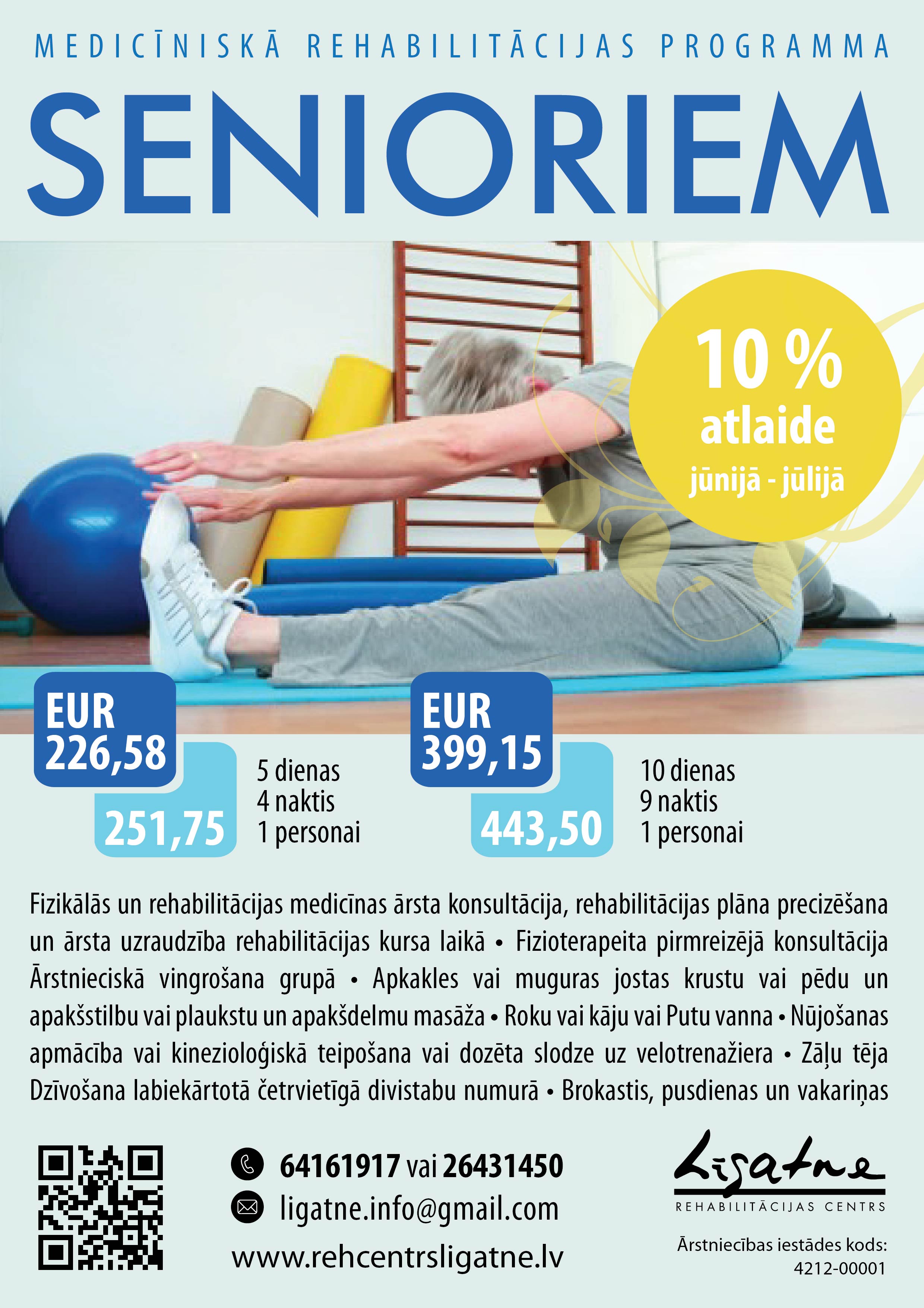 Jūnijā un jūlijā medicīniskās rehabilitācijas atveseļošanas programmām Senioriem 10% atlaide!!