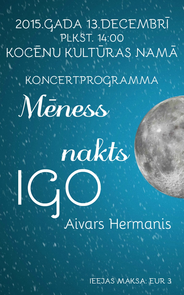 Svētdien, 13. decembrī, plkst. 14.00 Kocēnu kultūras namā ar īpašu koncertprogrammu “Mēnessnakts” uzstāsies leģendārais mūziķis Igo. “Mēnessnakts” ir Ziemassvētkiem sagatavota koncertprogramma, kurā iekļautas Igo un Aivara Hermaņa kopīgi radītās kompozīcijas, kā arī pasaules mūzikas klasika Aivara Hermaņa ģitāras aranžējumā. Domājot par Ziemassvētku laiku un gatavojot šo programmu, Igo ir ieskaņojis dziesmu “Mēnessnakts” ar Aivara Hermaņa mūziku un Aspazijas dzeju.