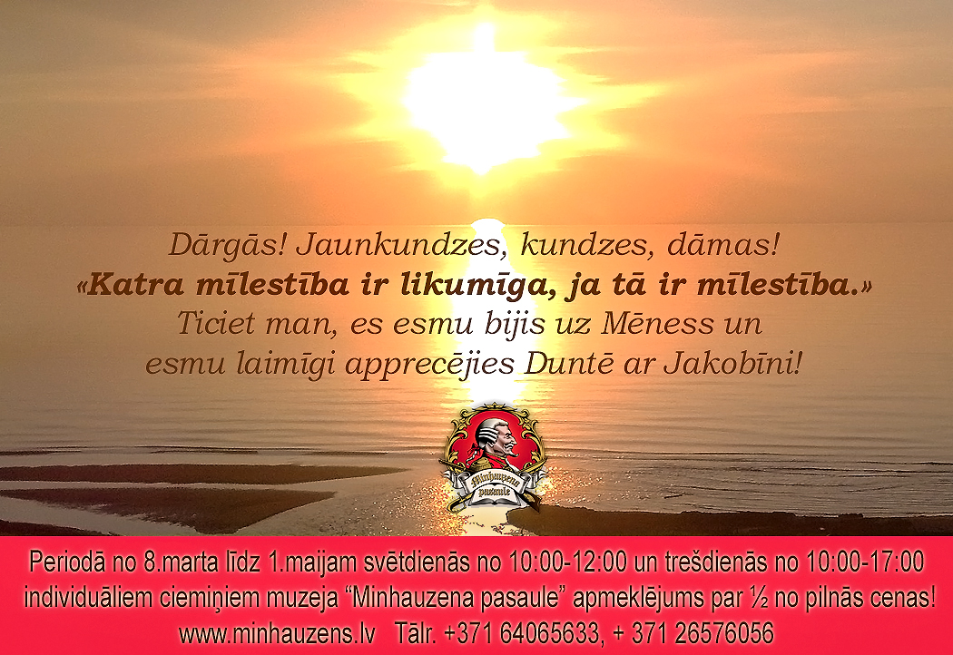 “Minhauzena Pasaule” aicina ciemos apmeklēt muzeju, izmantojot mūsu pavasara sezonas īpašo piedāvājumu martā un aprīlī trešdienās visu dienu un svētdienās no plkst. 10.00 - 12.00 ieejas biļetes muzejā individuālajiem apmeklētājiem par puscenu.
