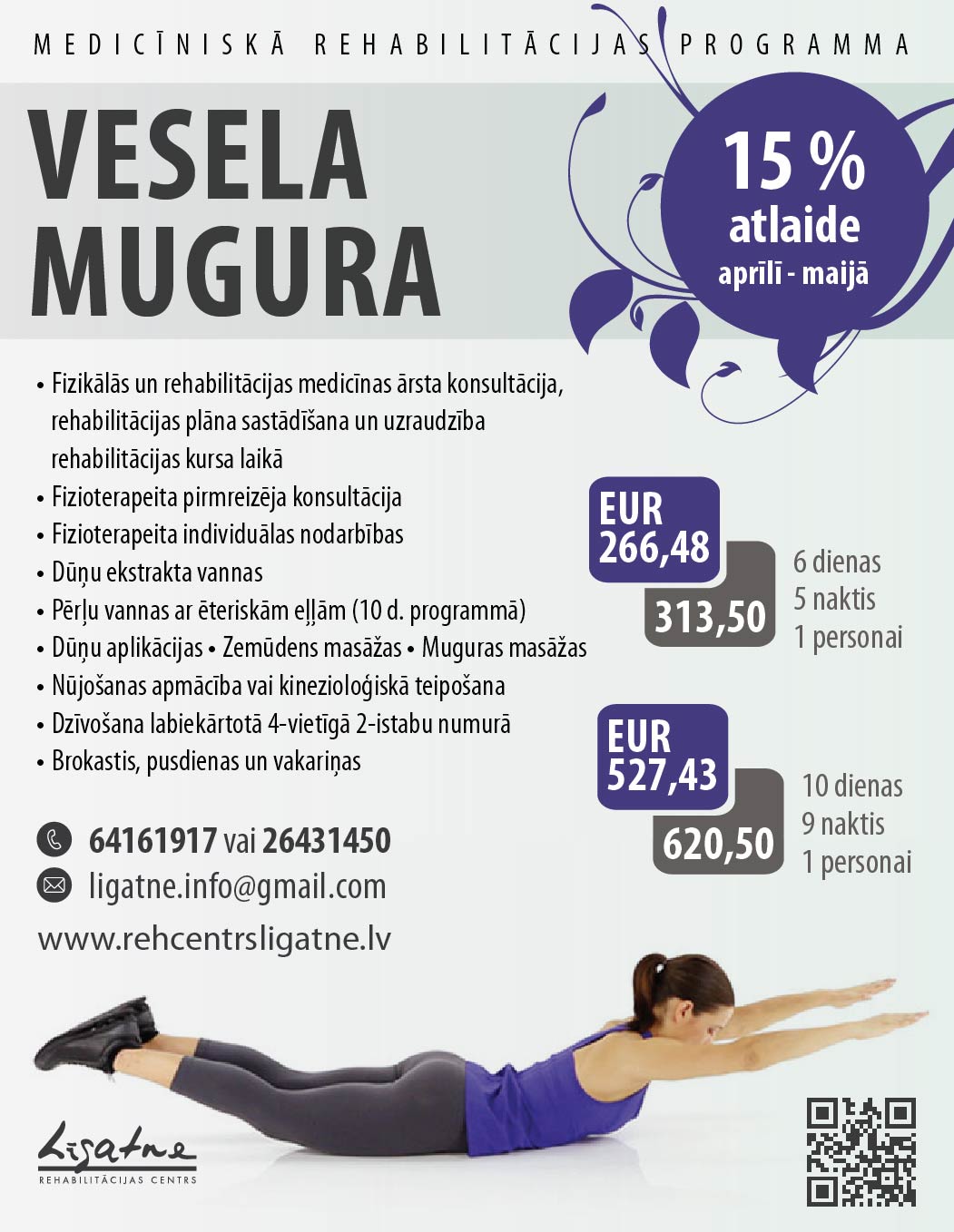 Vai Jums ir nepietiekamas kustības un sēdošs darbs? Tas viss izraisa muskuļu saspringumu un muguras sāpes. Rehabilitācijas centrs “Līgatne” aprīlī un maijā piedāvā 15% atlaidi medicīnas rehabilitācijas programmai “Vesela mugura”. Programmas mērķis ir mazināt muguras sāpes, uzlabot kustību apjomu, muskuļu spēku un Jūsu dzīves kvalitāti.