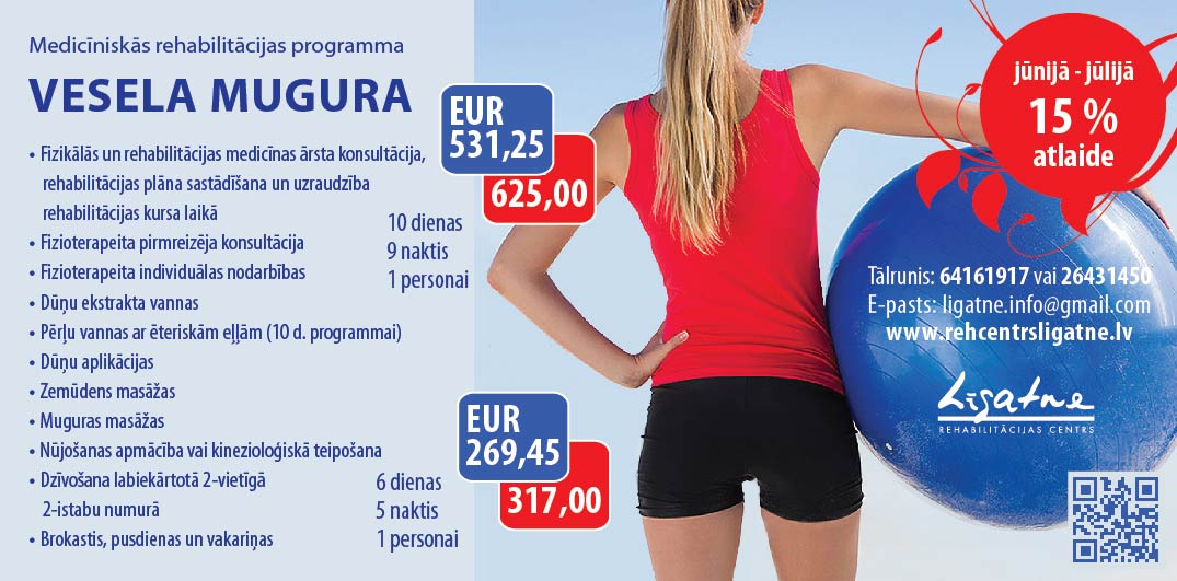 Rehabilitācijas centrs “Līgatne” jūnijā un jūlijā piedāvā 15% atlaidi medicīnas rehabilitācijas programmai “Vesela mugura”. Izmanto iespēju! Programmas mērķis ir mazināt muguras sāpes, uzlabot kustību apjomu, muskuļu spēku un dzīves kvalitāti.