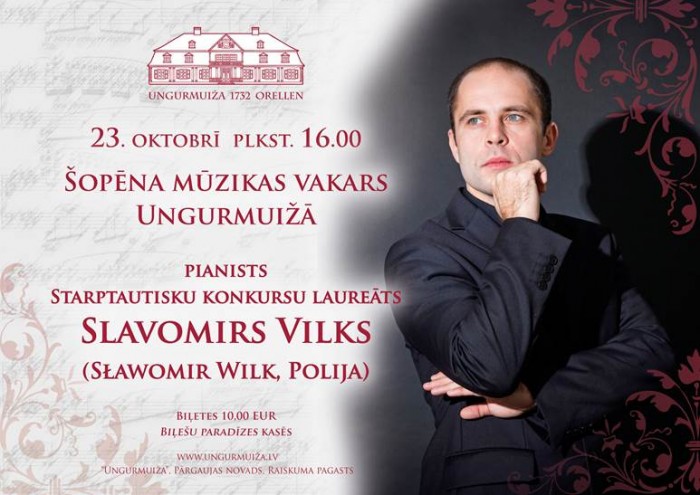 23.oktobrī plkst. 16.00 Ungurmuižā uzstāsies pianists no Polijas, daudzu starptautisku konkursu laukreāts Slavomirs Vilks (Sławomir Wilk).