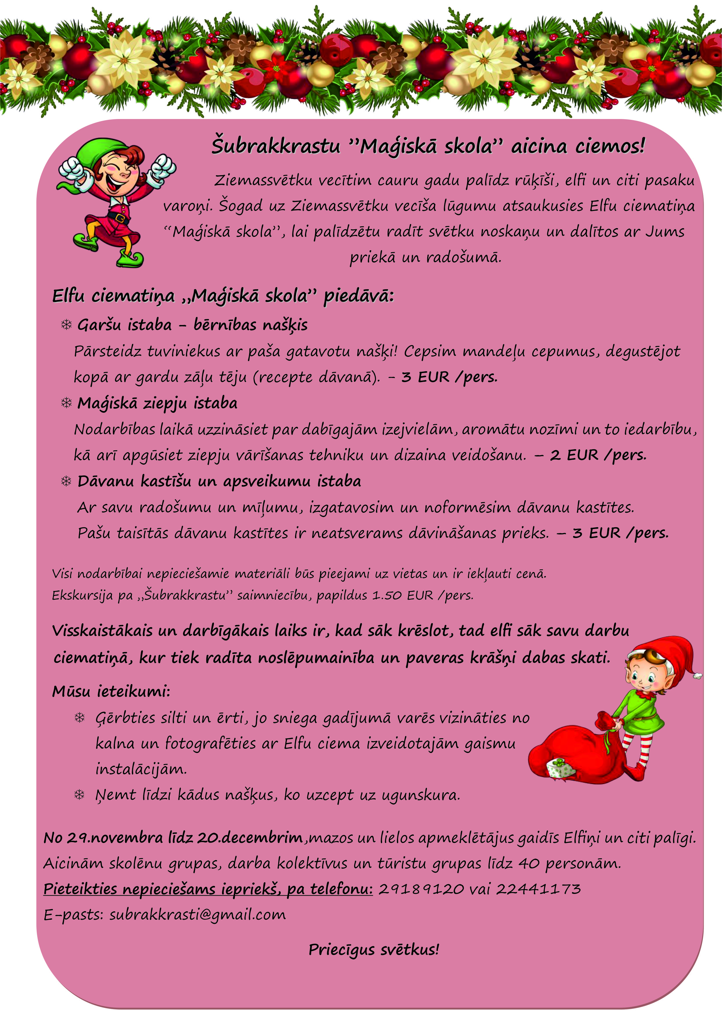 Adventes laikā, sākot ar 29.novembri, viesu nams “Šubrakkrasti” piedāvā īpašas ekskursijas pa saimniecību un viesošanos Elfu ciemata "Maģiskajā skolā". Visskaistākais un darbīgākais laiks ir, kad sāk krēslot. Tad elfi sāk savu darbu ciematiņā, kur tiek radīta noslēpumainība un paveras krāšņi dabas skati.