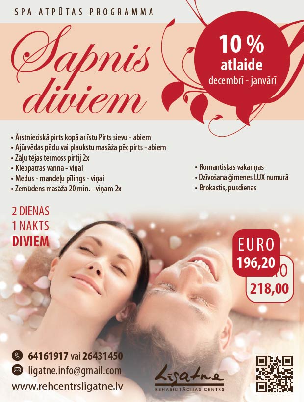 Rehabilitācijas centra “Līgatne” piedāvājums varētu būt īstā izvēle! Galvenā SPA programmas odziņa – ārstnieciskā pirts procedūra kopā ar īstu Pirts sievu. Pirts rituāla laikā baudīsiet Līgatnes zāļu tēju un ļausieties pēdu vai plaukstu ājurvēdas masāžai. Programmā ir iekļautas arī ārstnieciskas un relaksējošas procedūras: Kleopatras vanna, medus - mandeļu pīlings (viņai ) un zemūdens masāža (viņam). Kopā varēsiet baudīt romantiskas vakariņas un dzīvot Lux numuriņā. Brokastis un pusdienas ietilps piedāvājumā.