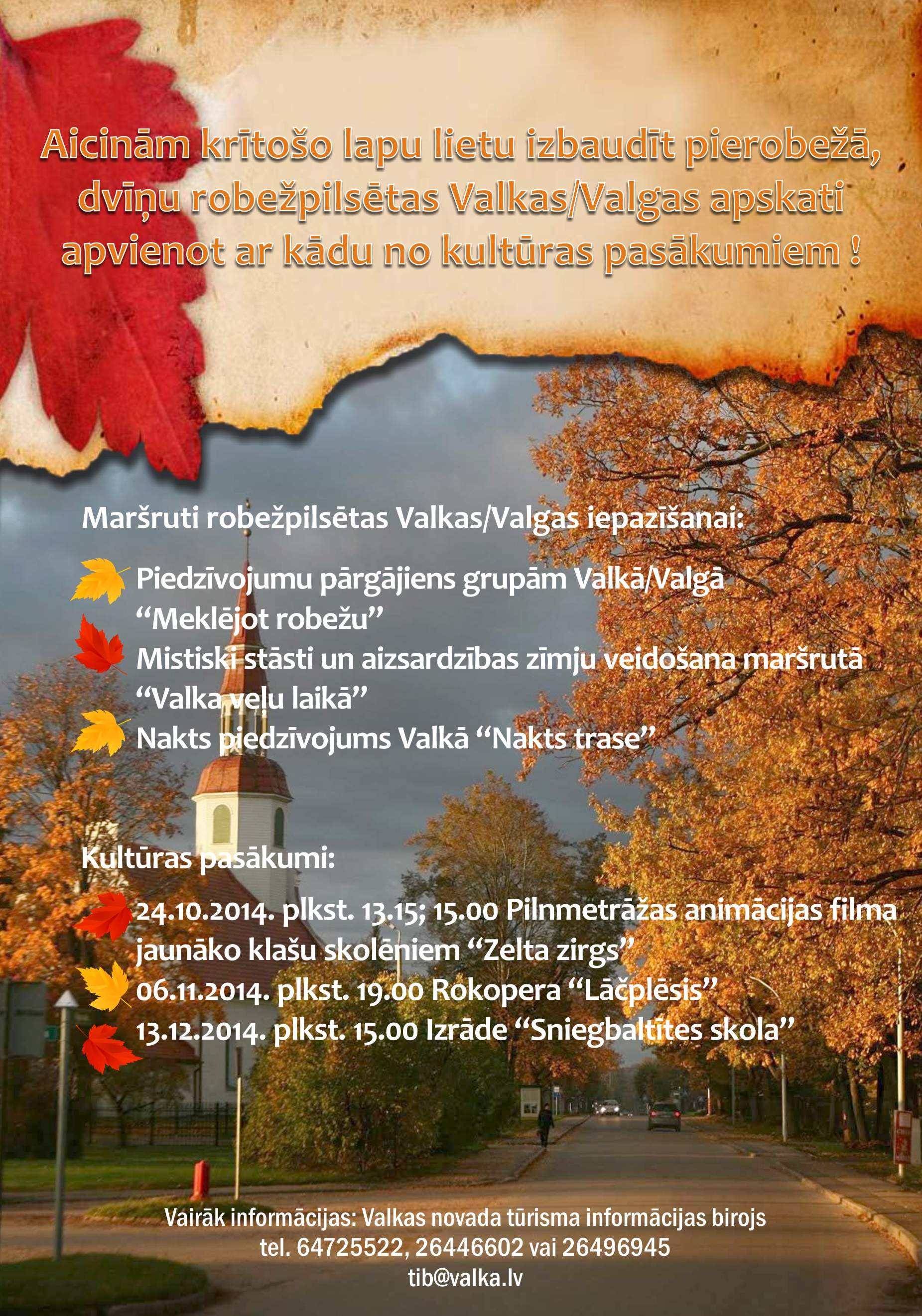 Rudens ir ražas, krāsaino lapu un mistiskais veļu laiks, Valkas pilsēta aicina to pavadīt pierobežā, iepazīties ar unikālajām dvīņu robežpilsētām Valku/Valgu un dienas noslēgumā apmeklēt kultūras pasākumu Valkas pilsētas kultūras namā.