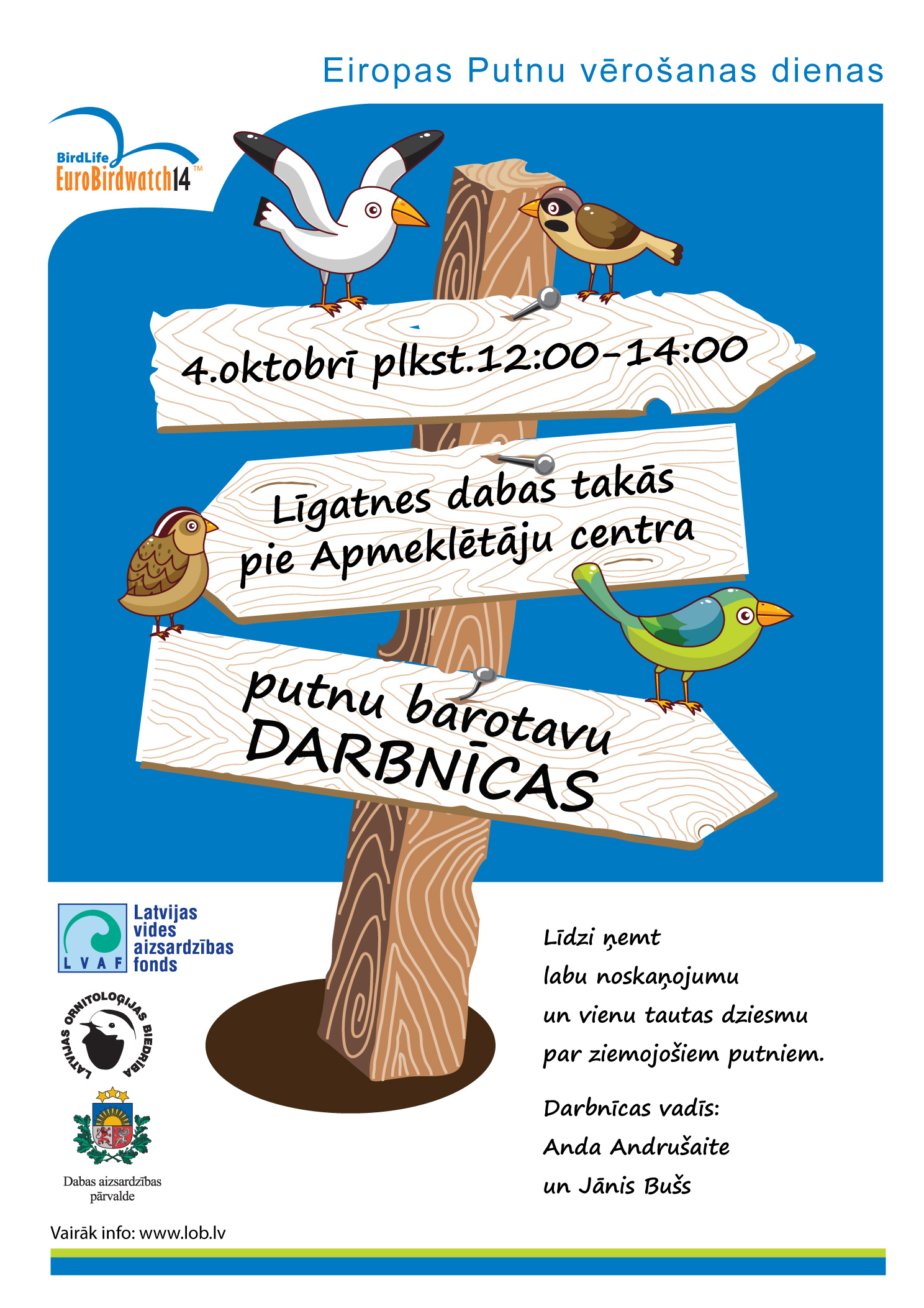 Sestdien, 4. oktobrī Līgatnes dabas takās gaidīti visi, kas gatavojas šoziem nākt talkā mūsu putniem- nometniekiem, sagādājot tiem cienastu. Kā pareizi pagatavot putnu barotavu, varēs uzzināt darbnīcā, kas no plkst. 12:00 līdz 14:00 darbosies pie Līgatnes dabas taku apmeklētāju centra. Šajā nedēļas nogalē aicinām piedalīties arī citos Putnu dienu pasākumos, kas notiks visā Latvijā. Uzmanību! Lai piedalītos darbnīcā, līdzi jāņem viena tautasdziesma par kādu no Latvijā ziemojošajiem putniem.